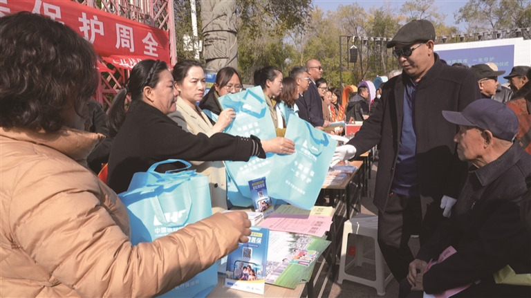 近日,昌吉州、昌吉市2025年全民参保集中宣传月启动仪式现场,工作人员为过往群众发放医保宣传资料并讲解相关政策。□赵黎声摄
