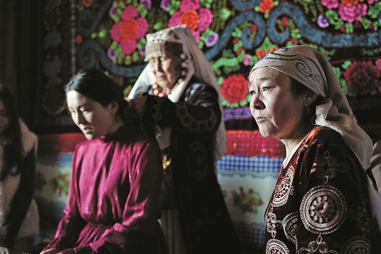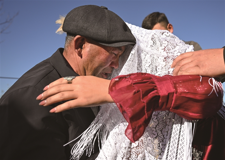 孔吐斯·也斯达吾列提的母亲(右一)在“哭嫁”仪式上落泪(10月11日摄)。□新华社记者 徐宏岩摄