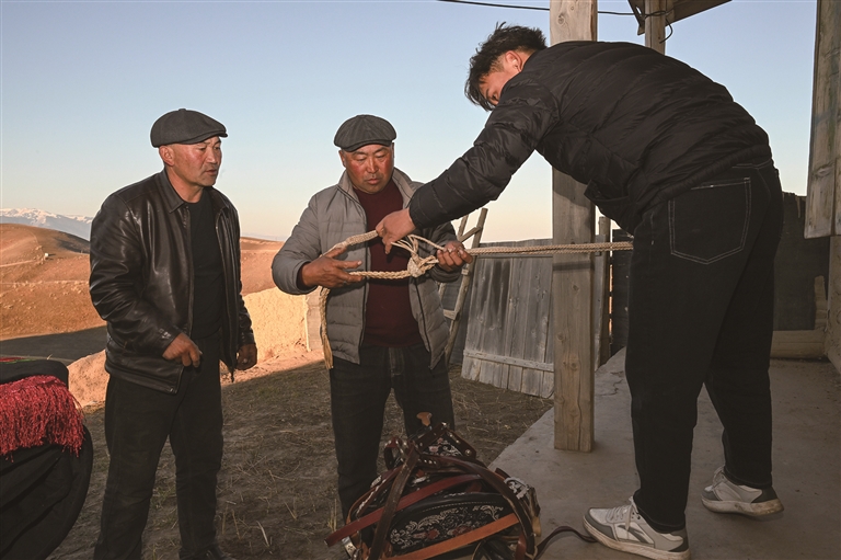 出嫁当天上午,孔吐斯·也斯达吾列提的父亲(左)和亲戚一起准备鞍具等用品,鞍具和马匹是孔吐斯的嫁妆(10月11日摄)。