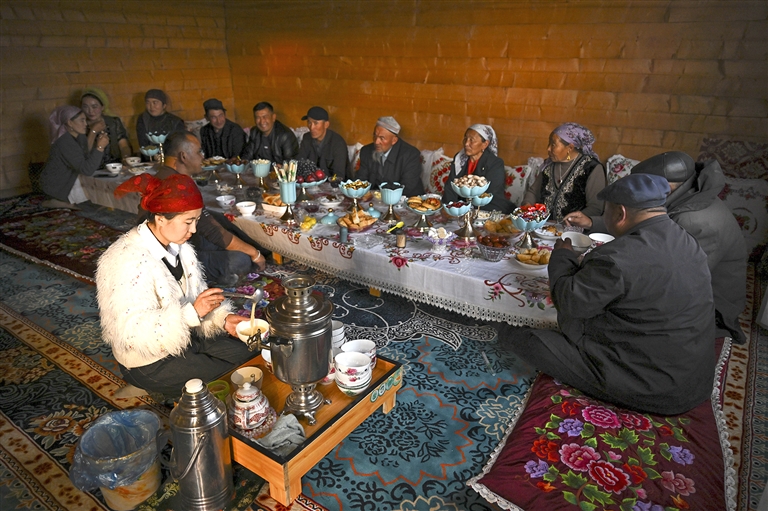 出嫁前一晚,男方亲戚抵达冬牧场,女方家设宴款待,孔吐斯·也斯达吾列提的嫂子(白衣者)在一旁为客人倒奶茶(10月10日摄)。