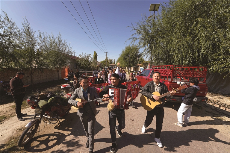 在特克斯县喀拉达拉镇加尔阔拉村,迎亲队伍向新郎家行进(10月11日摄)。□新华社记者 徐宏岩摄