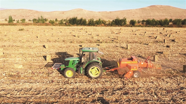 在旱卡子滩乡闽玛生态村,秸秆打捆机正忙碌作业,将散落的玉米秸秆压实成饲草包。