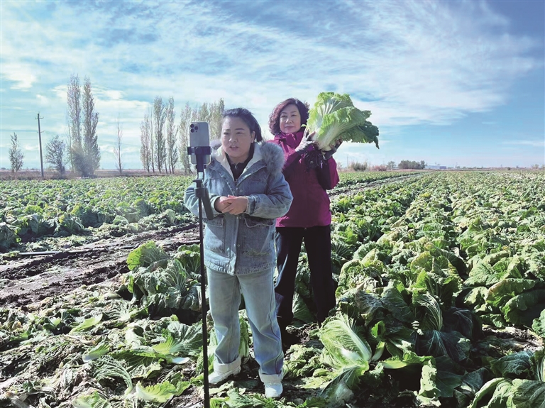 近日,在吉木萨尔县北庭镇西上湖村的白菜地,网络达人在进行助农直播。