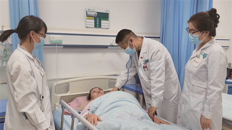 近日,木垒县总医院内二科医生为患者做检查。□张旭祥摄