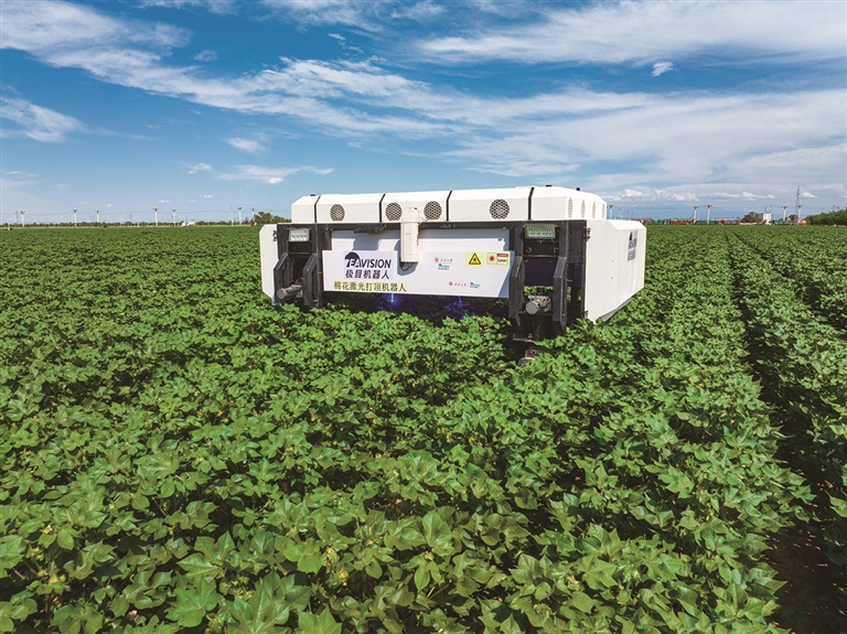 棉花生长期,棉花激光打顶机器人对棉花顶芽的识别准确率达98.9%,作业效率可达每小时6亩至8亩,是人工作业效率的10倍以上,成为棉花实现从种植到采收全程机械化的关键技术支撑。