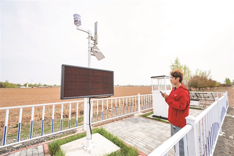 5月18日,昌吉国家农业高新技术产业示范区智慧农场,新疆慧尔智联技术有限公司技术人员在调试气象监测设备。