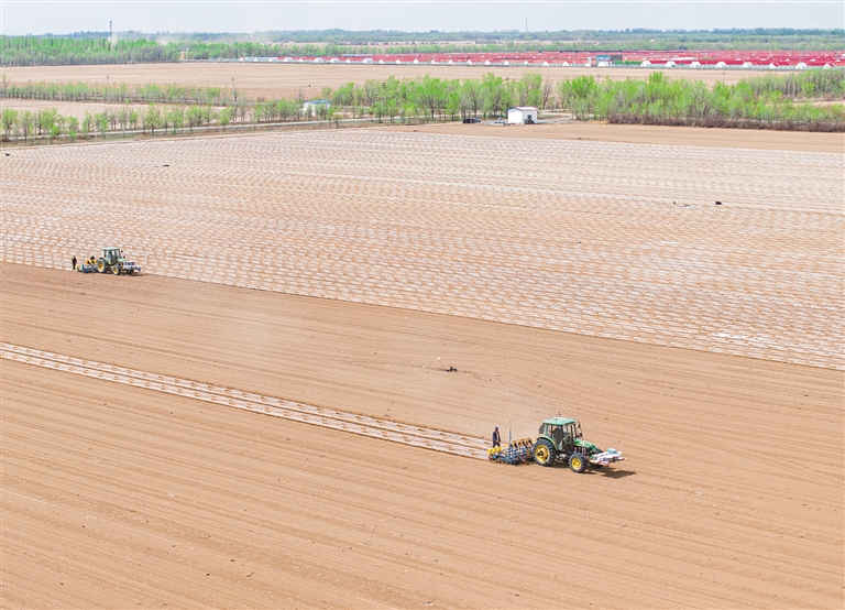 4月28日,昌吉国家农业高新技术产业示范区智慧农场,种植户在用北斗卫星导航无人驾驶拖拉机播种棉花。