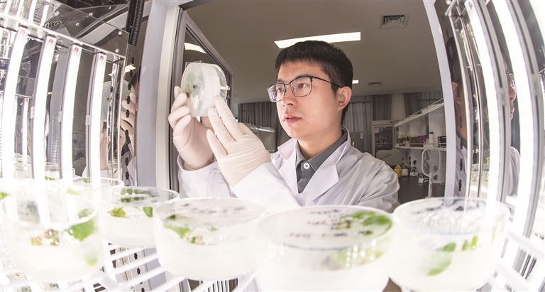 3月17日,位于昌吉国家农业高新技术产业示范区的中国农业科学院西部农业研究中心棉花生物育种与综合利用全国重点实验室新疆中心,研究员在观察基因编辑棉花品种植株的长势。