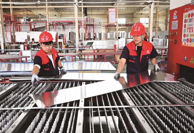10月29日,在昌吉国家高新技术产业开发区的新疆星旭铝业有限公司生产车间内,工作人员正在铝单板生产线上作业。 今年5月,该公司年产50万立方米铝单板及太空舱生产基地建设项目正式达产,该项目填补了昌吉州高端铝单板装饰材料与太空舱系列产品的空白。 □本报记者 何 龙摄