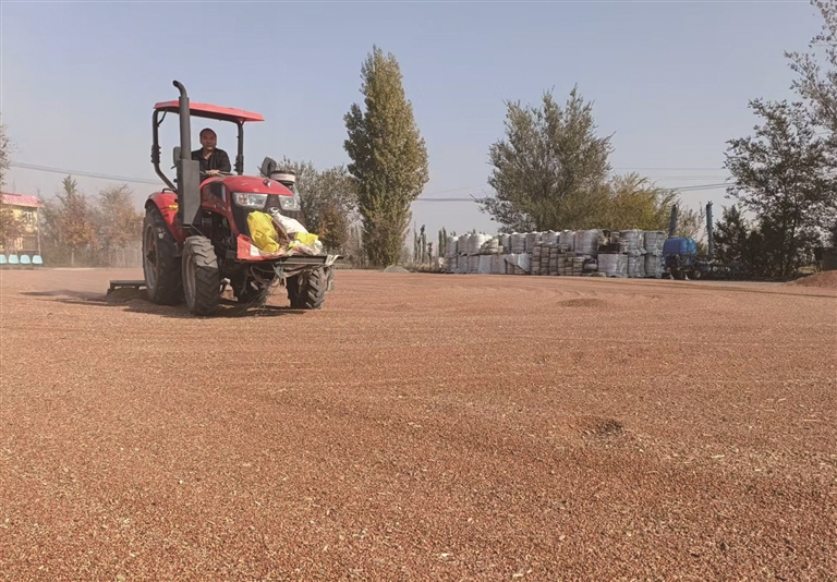 10月31日,在吉木萨尔县二工镇六户地村的晒场,农户驾驶着小型拖拉机翻晒红高粱。□张德峰摄