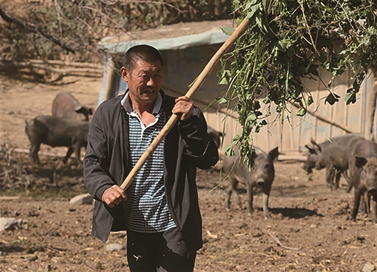 10月22日,木垒县英格堡乡庙尔沟村养殖户张万忠在给黑猪喂草。□姜 巍摄