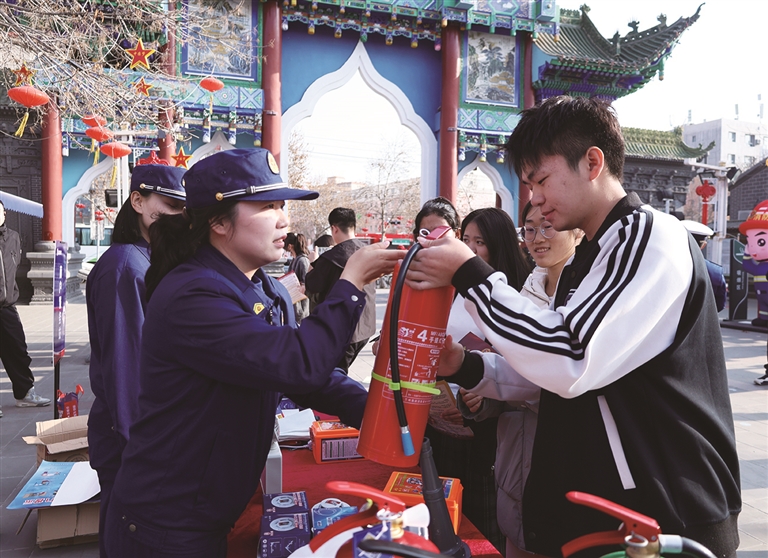 11月3日,昌吉小吃街,消防救援人员向群众讲解灭火器的使用方法。