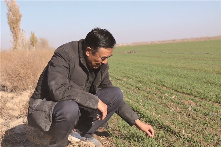 左图:近日,在吉木萨尔县吉木萨尔镇校场湖村,种植户吕志斌查看小麦长势。