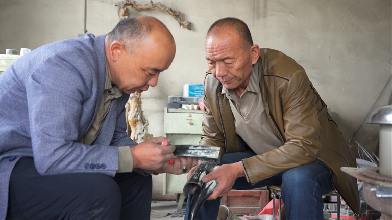 后来,逯永成开设了一家骨雕工艺品店,专门展销师徒俩的作品,还通过电商平台将作品销往全国各地。近年来,在两人的带动下,正格勒得村已有30多名各族村民前来学习骨雕技艺。工作室里,不同民族的学员一起学艺、创作,互帮互助,气氛融洽。