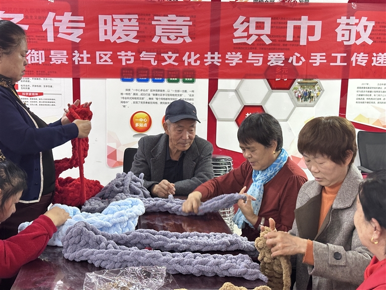 11月5日,社区居民一起编织爱心围巾。□马雪芳摄