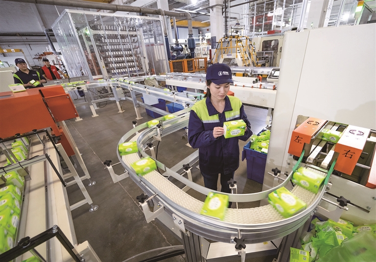 11月4日,工人在新疆恒安纸业有限公司全自动面巾纸生产线上作业。今年,该公司引进智能化设备和技术,有效提升产能、降低能耗,预计每年可生产5000吨高档生活用纸,实现产值5000万元,产品销往全国市场并出口哈萨克斯坦、乌兹别克斯坦等中亚国家。□本报记者 何 龙摄