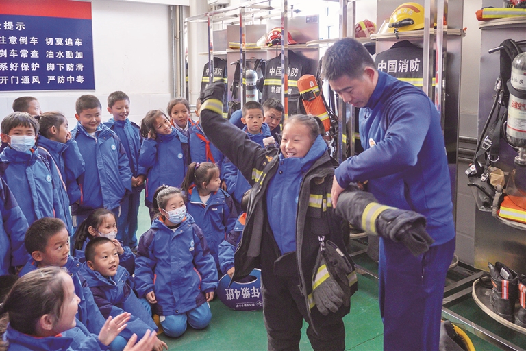 为进一步加强校园消防安全教育,切实提高师生的消防安全意识和自防自救能力,11月7日,昌吉市第十小学组织学生代表走进昌吉市消防救援大队,开展了一场以“探秘‘火焰蓝’,童心悟安全”为主题的沉浸式社会实践活动。 活动中,消防救援人员详细讲解各类救援器材在灭火救援任务中的用途;学生体验了消防装备的穿戴,近距离感受消防救援人员的日常工作。 □杨 斌摄