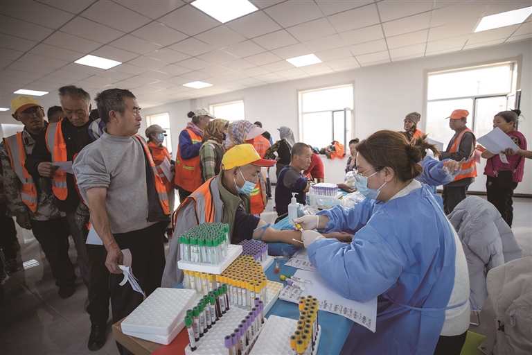 近日,昌吉市环卫中心市容大队,环卫工人排队抽血化验。