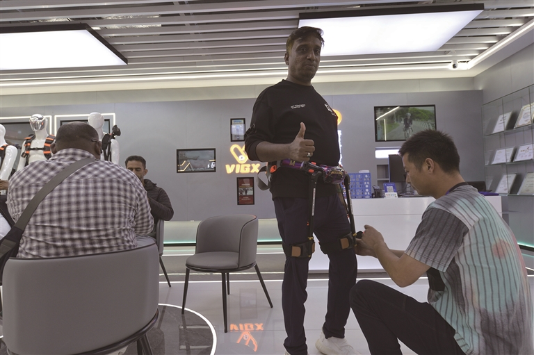 10月30日,在浙江省义乌市全球数贸中心的一家商店内,一名外籍商人试穿机械外骨骼。