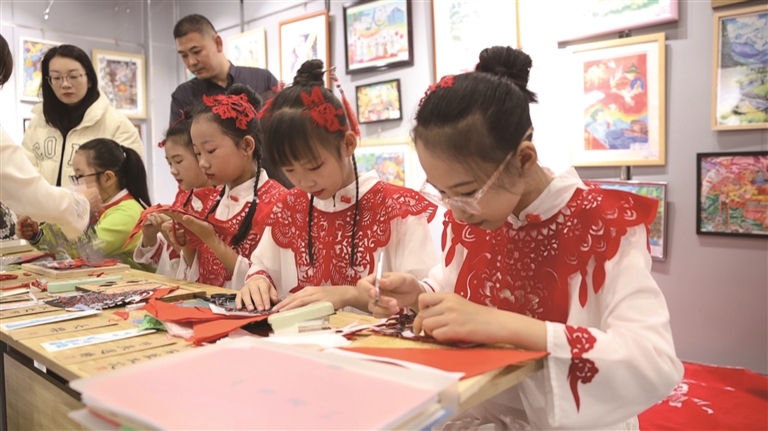 11月13日,昌吉州第六届“翰墨润心传承经典”暨昌厦两地中小学师生书画作品联展在昌吉市美术馆启幕,两地学生正在进行剪纸创作。 □吕振江摄