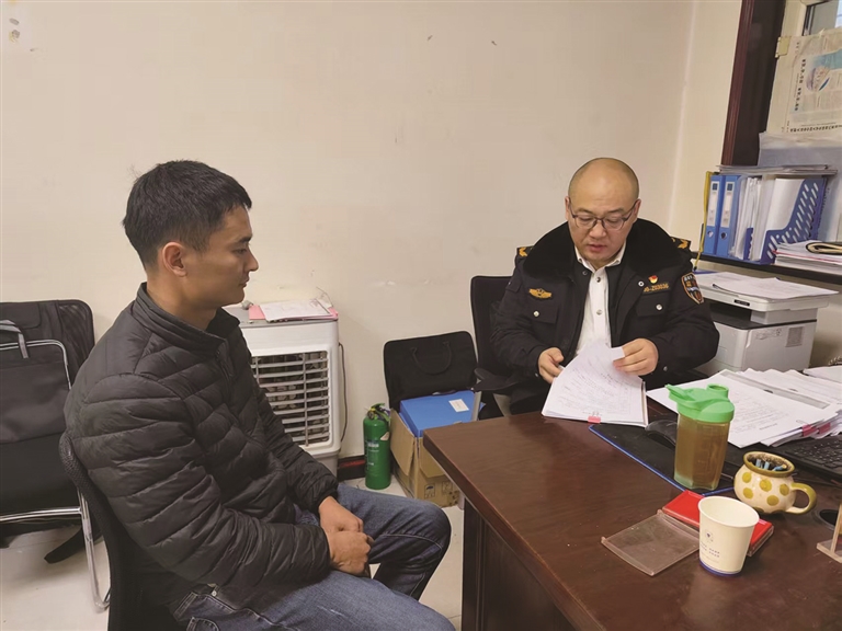近日,昌吉市劳动保障监察中心监察员(右一)给农民工高臣龙讲解依法讨薪程序。□张 楼摄