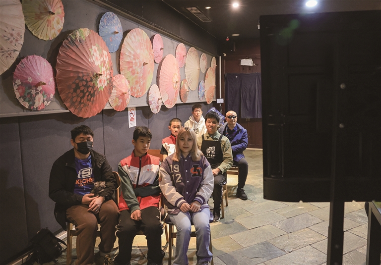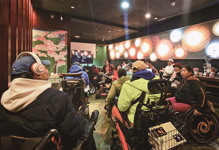 10月26日,在木马童话黑暗餐厅,肢体残疾人士在观影后交流。□新华社发(向兰兰摄)