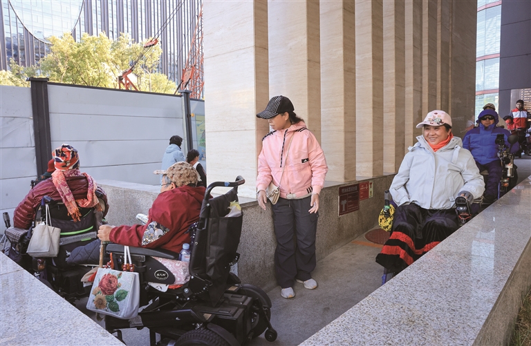 10月26日,志愿者在帮助肢体残疾人士观影后离开。