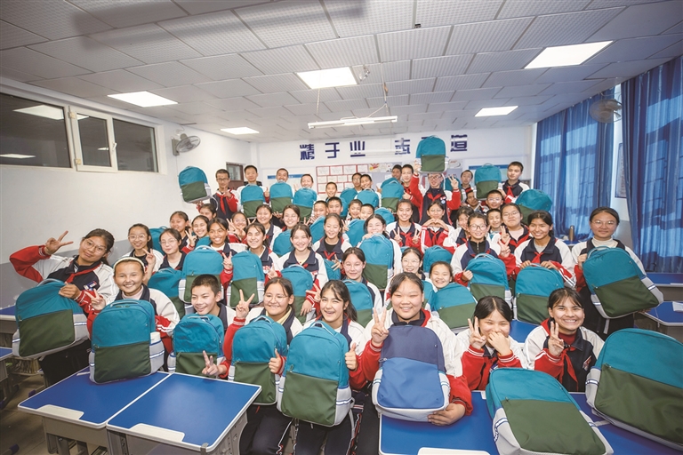 近日,昌吉市第七中学,学生们开心地展示新书包。出席新疆维吾尔自治区成立70周年庆祝活动的中央代表团向该校赠送的爱心书包目前已全部发放到位。 □本报记者 巨海成摄