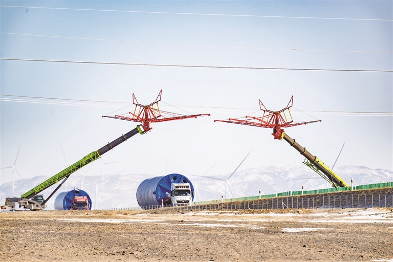 11月19日,在木垒县昌吉花语升压汇集站220千伏送出工程现场,工程车辆缓缓驶入作业区。 项目开工后,将新建1条220千伏线路,线路全长54.8公里。项目建成后,可满足当地新增风电项目接入电网需求,提升能源消费绿色化水平。据了解,国网昌吉供电公司今年在木垒县建设的新能源电网项目共计12项,目前已建成投运8项,预计年底完成全部工程投产任务,为木垒县绿电外送提供坚实保障。□本报记者 巨海成摄