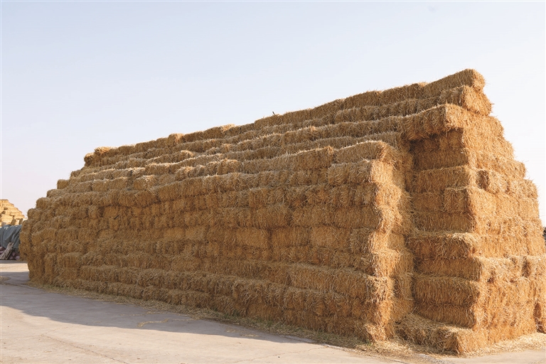 在位于昌吉市二六工镇的昌吉市乾源牛羊育肥专业合作社内,饲草区内的干草堆成小山。□叶尔克西摄