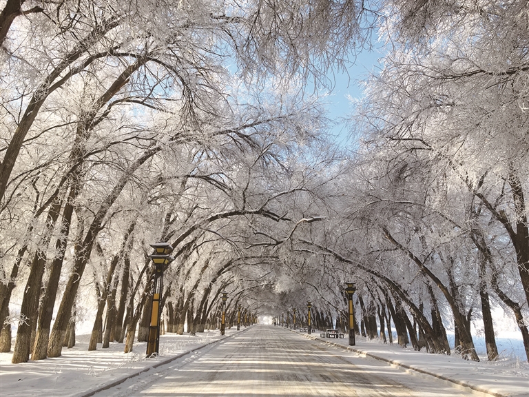 11月28日,吉木萨尔北庭国家湿地公园在银装素裹中化身为梦幻的冰雪仙境。公园内备受瞩目的“网红树洞”被雾凇温柔包裹,枝桠交织成一道天然画框。阳光从枝叶的缝隙间轻盈洒落,在皑皑雪地上勾勒出斑驳的光影。树洞内外一片素白,仿佛一扇由冰雪雕琢而成的童话之门。游客随手一拍,皆是氛围感满满的冬日大片。□杨天文摄