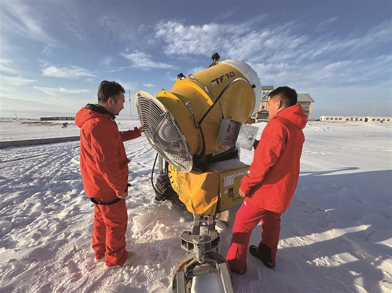 努尔加滑雪场工作人员正在检查造雪机。□刘 华摄