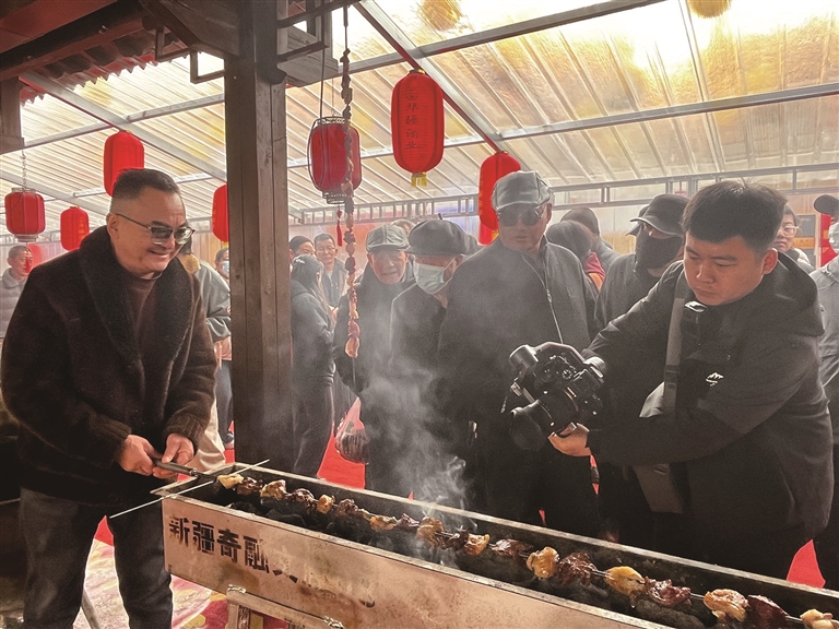冬日的奇台古城商业街,烟火气正浓。人潮涌动的“冰屋”烧烤集,黄面凉皮的爽口、各色烧烤的焦香、特色小吃的鲜香交织弥漫。现场贴心供应的免费热水,让游客暖胃又暖心。奇台县杨大拿一号黄面店的创意格外吸睛。1.5米长的超大羊肉串,单根签子可串起600克鲜切羊肉,20至30签便能串起一整只羊羔肉的份量,尽显奇台饮食的豪爽与独特魅力。