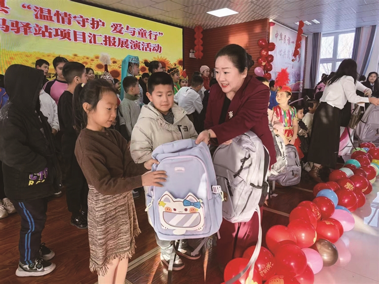 近日,吉木萨尔县举办“爱心妈妈”驿站项目汇报展演暨赋能培训活动。图为吉木萨尔县妇联为小朋友发放微心愿礼物。□徐芯桐摄