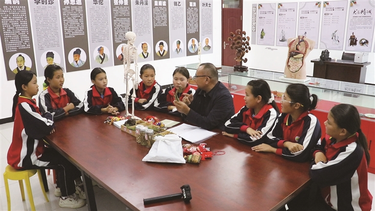 在呼图壁县五工台镇小学李时珍中医药课堂上,老师正在讲解中药材的功效和使用方法。