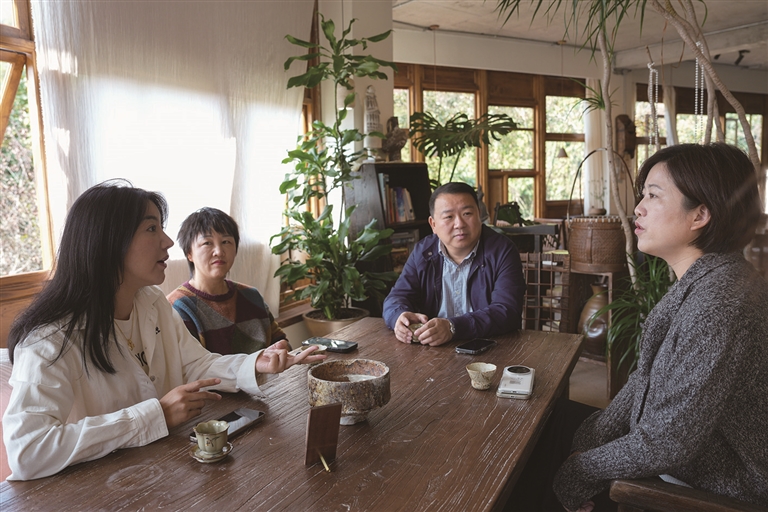 2025年11月14日,浙江省宁波市奉化区溪口镇东山村乡村CEO胡亮玉(左一)与民宿主徐小风(左二)、董凤洁(右一)和东山村党支部书记、村委会主任徐佩伦(右二)在一起讨论民宿及文旅综合体项目发展。2024年,东山村“乡村CEO”(农村集体经济经理人)完成招募、竞聘、上岗。
