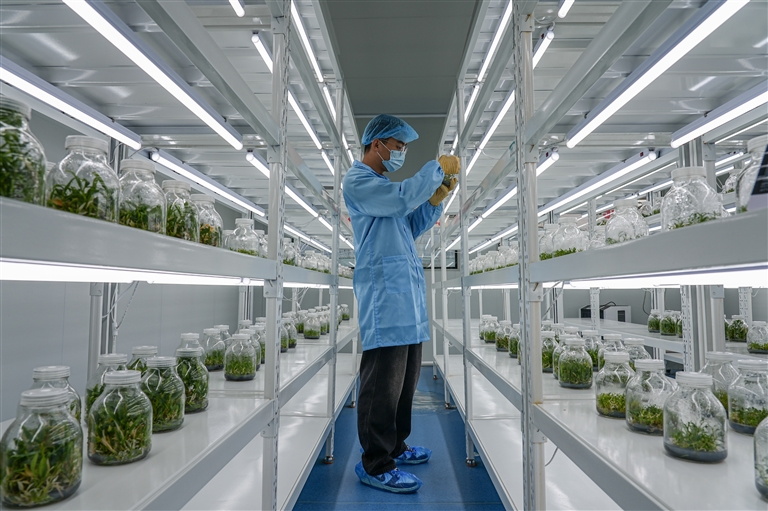 11月7日,农技人员在双泉庄村中草药脱毒组培苗繁育实验室内观察石斛秧苗。 近年来,山东省济南市长清区马山镇双泉庄村实施“党支部+合作社+农户”合作方式,在相关部门对口帮扶下,共建“中草药脱毒组培苗繁育实验室”,推动中药材规模化种植。同时,该村还依托山区资源,引进投资,打造民宿片区,布局道地药材、生态旅游等特色产业,形成产业联动良性循环,激发山村发展新动力。□新华社记者 朱 峥摄