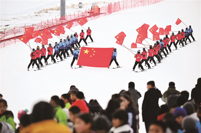 12月6日,昌吉州“冬游天山别样暖”冰雪嘉年华暨阜康市冰雪风情季、天山天池国际滑雪场开板仪式活动现场,国旗方队从山坡滑下。
