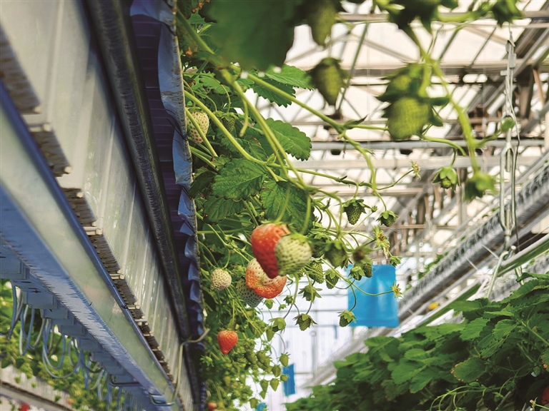 在新疆玖运景致农林科技有限责任公司的佰景鲜果园里,新品种草莓在智能化温室中长势喜人。□曹翔宇摄