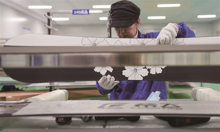 12月4日,在吉林化纤国兴复合材料有限公司车间内,工作人员复检公司自主研发生产的碳纤维滑雪板。