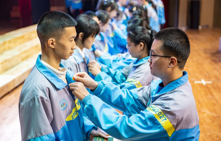 12月9日,昌吉州第一中学新校区报告厅,老团员为新团员佩戴团员徽章。