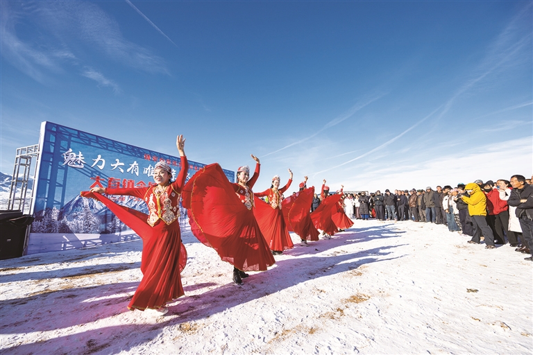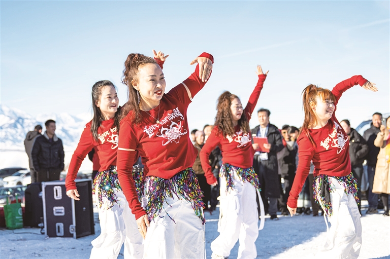 吉木萨尔县大有镇今冬明春冰雪旅游季开幕式上,村民表演的文艺节目吸引众多游客驻足欣赏。