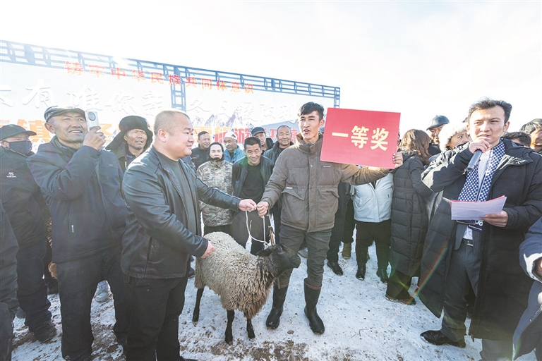 吉木萨尔县大有镇今冬明春冰雪旅游季开幕式上,为获得刁羊冠军的队伍颁奖。