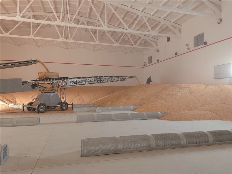 项目现场,6栋标准化散装平房仓整齐排列,均配备保温隔热设施与智能化粮情监测系统。工作人员正将玉米从运输车上卸下,通过传送带有序运入仓内,整个过程高效顺畅。目前,首批2.1万吨玉米已顺利入库,所有粮食均经过严格质量检测,各项指标符合国家标准。