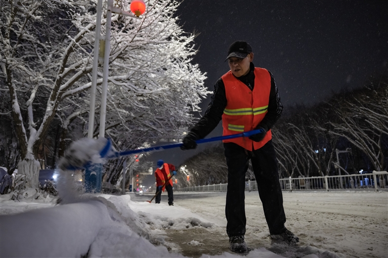 12月11日7时,昌吉市环卫中心出动环卫工人580人,分派到市区主要街道、公交站台、十字路口、导流岛等机械触及不到的位置进行清雪。环卫工人手持铁锹、扫帚,重点清理人行道、非机动车道及交通节点积雪,确保行人和车辆通行安全。同时,昌吉市环卫中心根据天气变化及时调整作业方案,采取机械与人工相结合方式,提高清雪效率。