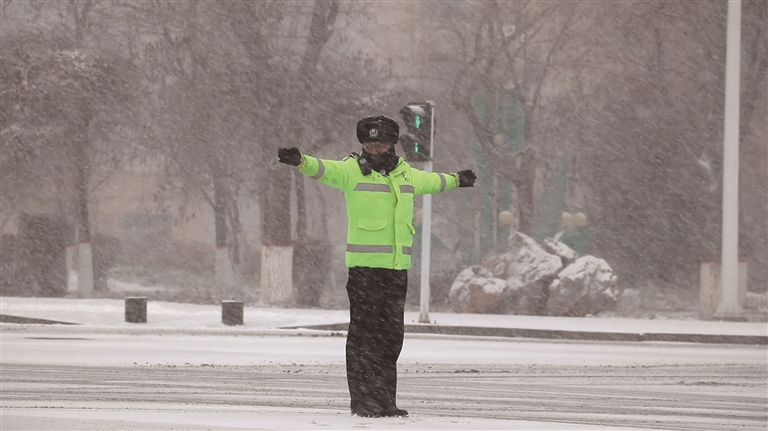 12月10日,呼图壁县执勤民警上路指挥交通,全力保障道路通行安全。□松哈尔·努尔阿迪力摄
