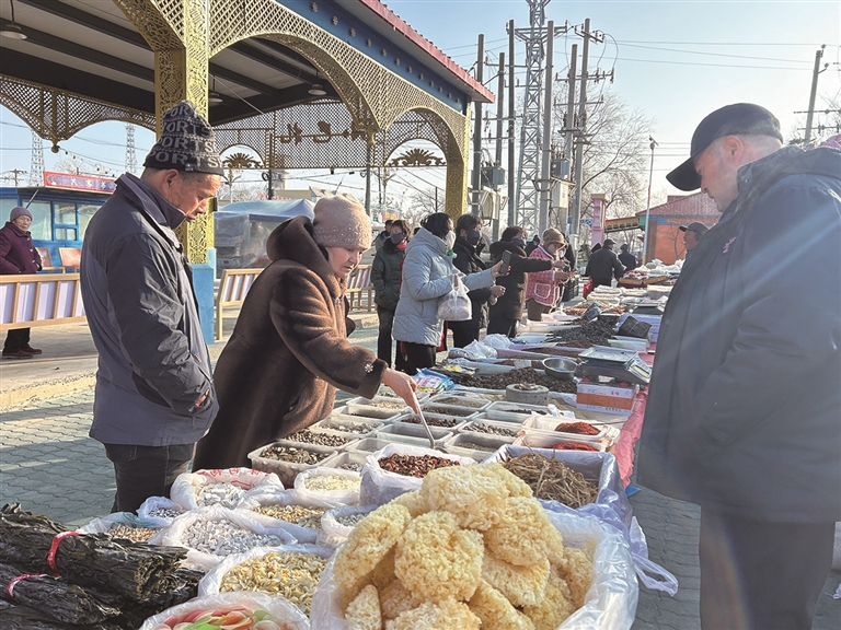 二十里店村村民热尼古丽·木沙的咸菜摊前,围着不少回头客。玻璃罐里的咸菜色泽鲜亮、咸香扑鼻。“大家都说我腌的咸菜够味儿,每周日我都来摆摊,能挣些钱贴补家用。”她一边麻利地为顾客装袋,一边笑意盈盈地说。