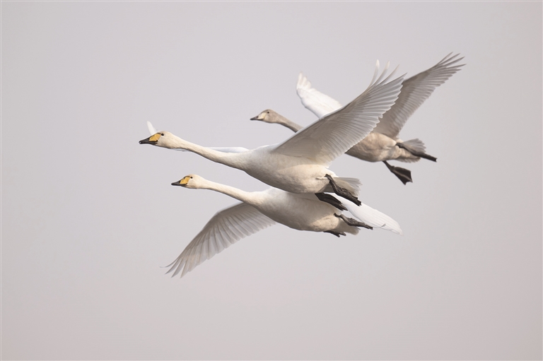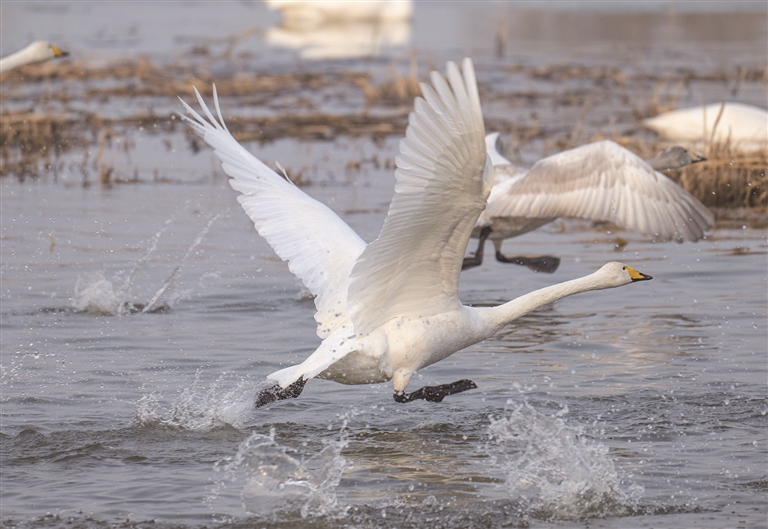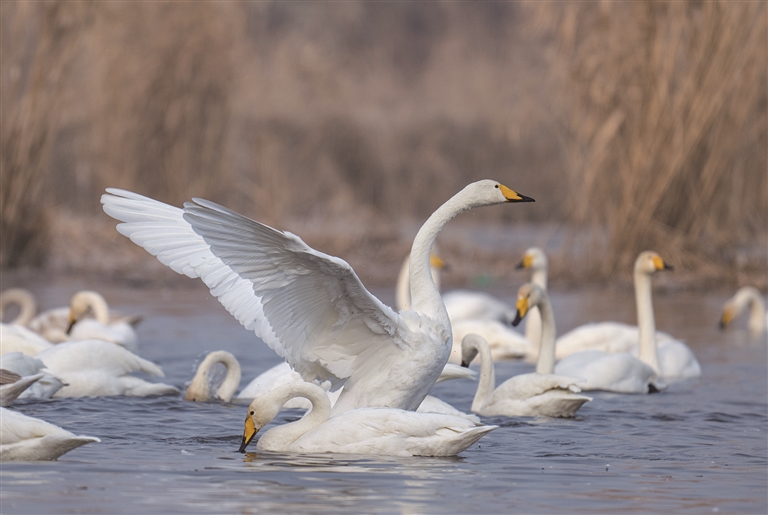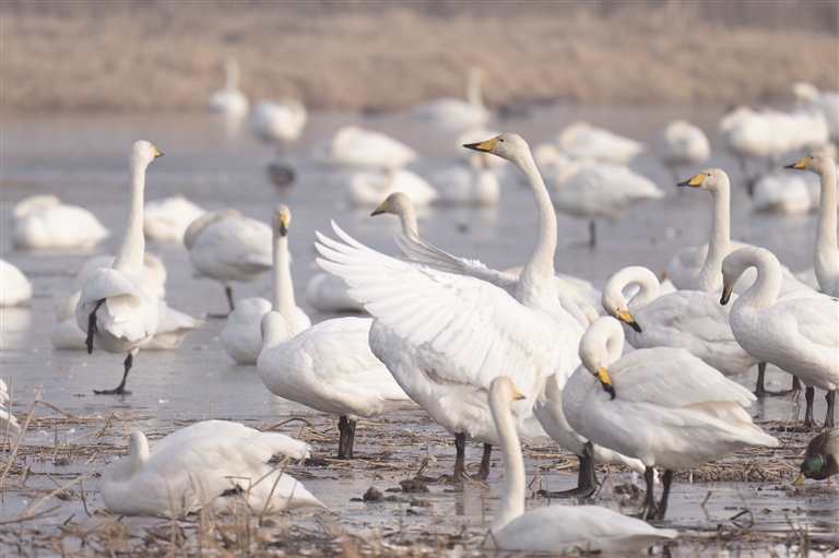 截至目前,抵达湿地的大天鹅已有500余只。而在2024年冬季,来此越冬的天鹅数量达到1000余只。近年来,得益于退耕还湿、生态补水等一系列保护措施,这里水域丰沛、水草茂盛,食物资源充足,已连续多年成为大天鹅稳定的越冬家园。