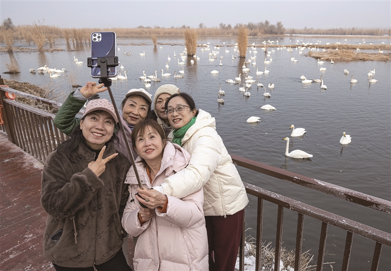 12月8日,游客在玛纳斯国家湿地公园打卡拍照。