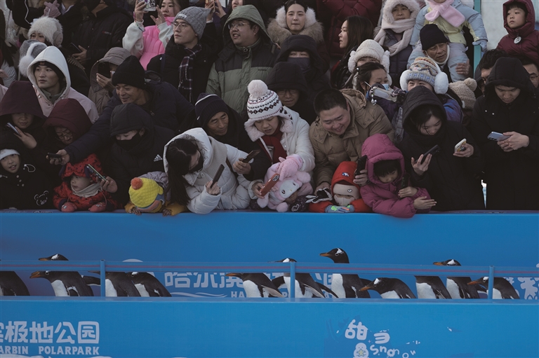 12月13日,人们在哈尔滨极地公园观看企鹅巡游。